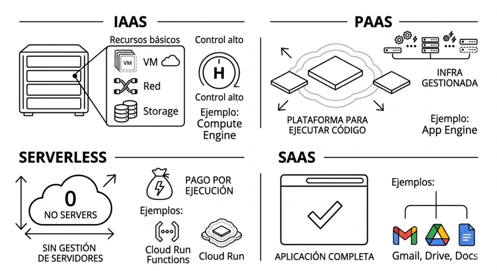 IaaS: Infraestructura básica en la nube, como máquinas virtuales o redes.